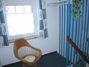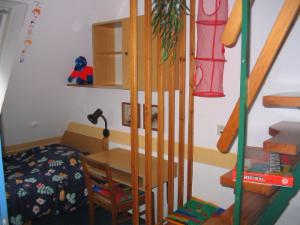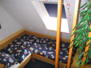 Hier stehen zwei Betten (90 x 200 cm und 90 x 190 cm) mit verstellbaren Lattenrosten und Hartschaummatrazen. Zur Einrichtung gehören weiterhin Leselampen an der Wand über den Betten, ein offenes Regal für Wäsche etc., darunter ca. 12 Kleiderhaken, ein Schränkchen mit Regal für Spiele und Bücher und ein Schreibpult zum Malen und Schreiben.