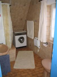 Das große Bad ist mit WC, Badewanne mit Duschabtrennung, großem Waschbecken sowie umfangreichen Ablagemöglichkeiten und Regalen ausgestattet.