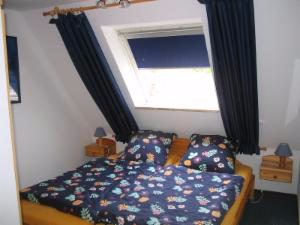 Der große Schlafraum (Elternsschlafzimmer) ist ganz in Blautönen gehalten und liegt mit seinem großen Veluxfenster zur Südwest-Seite. Hier steht ein Doppelbett (180 x 200 cm) mit verstellbarem Lattenrost und Federkernmatrazen zur Verfügung. Die Nachttischchen sind mit einer Schublade und einer Leselampe ausgestattet und bei Bedarf abnehmbar, z.B. wenn sie ein Kinderbettchen direkt neben dem Elternbett haben wollen.